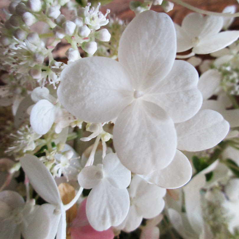 Bringing a bit of nature’s beauty indoors. White hydrangeas in a stamped & soda-fired vase.