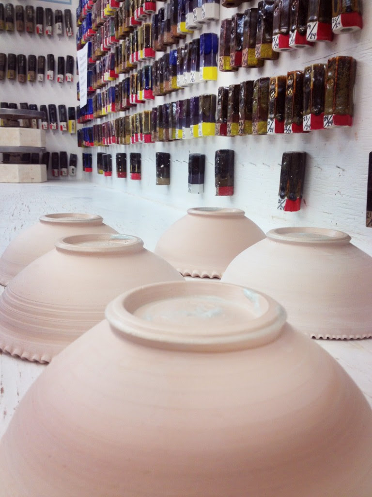 Since we’re in-between class sessions, I thought this morning might be a good chance to glaze my past class demo pieces. My students know all-too-well how much I “love” glazing and how my pots tend to pile up! Too many glazes. Too many options. Too many ways for the glaze to “ruin” my pots after I’ve employed some of my “control issues” to get them to this point.